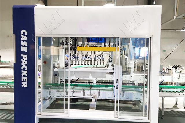 全自動(dòng)裝箱機(jī)處于包裝流水線的后道,通過吸盤將整列好的瓶子由線體裝入到紙箱當(dāng)中,從而起到操作工便于裝箱目的。